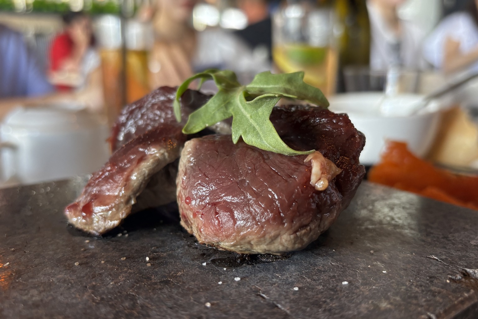 - アツアツの鉄板で自分好みの赤身に調整できる!