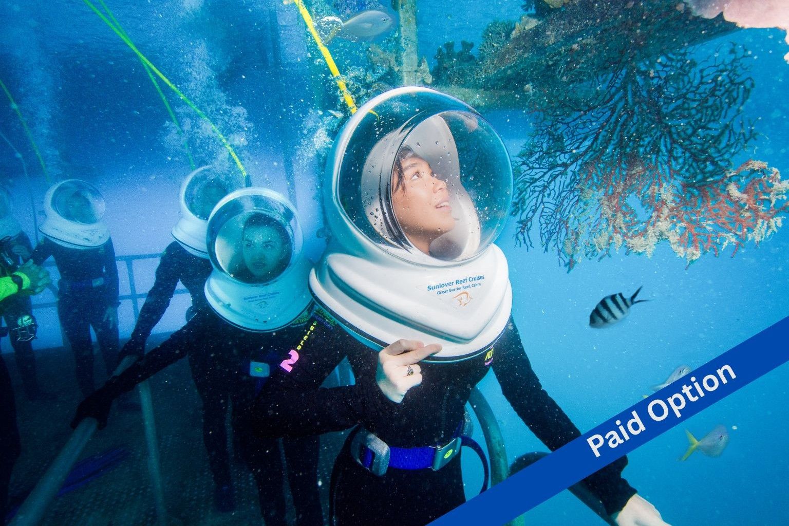 - 料金に含まれるもの クルーズチケット、スノーケリングセット(シュノーケル、マスク、フィン、クラゲ除けスーツ、ライフジャケット、)、コーヒー・紅茶のサービス(出航前とポンツーン滞在中)、トロピカルビュッフェランチ、魚の餌付けプレゼンテーション(ポンツーン)、海洋展望室(ポンツーン)、グラスボトムボート(ポンツーン)、半潜水艦(ポンツーン)