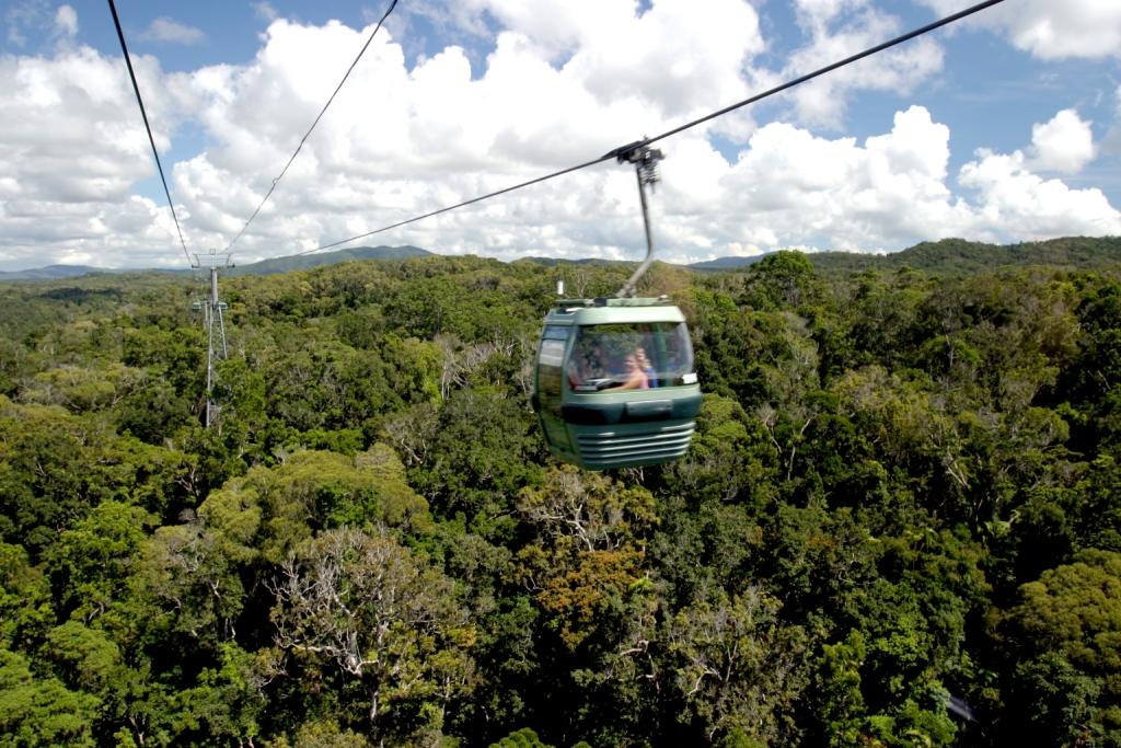 世界遺産熱帯雨林を上空から眺めるスカイレールのゴンドラに乗ってキュランダへ。キュランダでは思う存分自由行動を!キュランダからは鉄道ファンなら一度は乗ってみたいレトロな列車、キュランダ高原列車に乗ってケアンズまで戻ります。