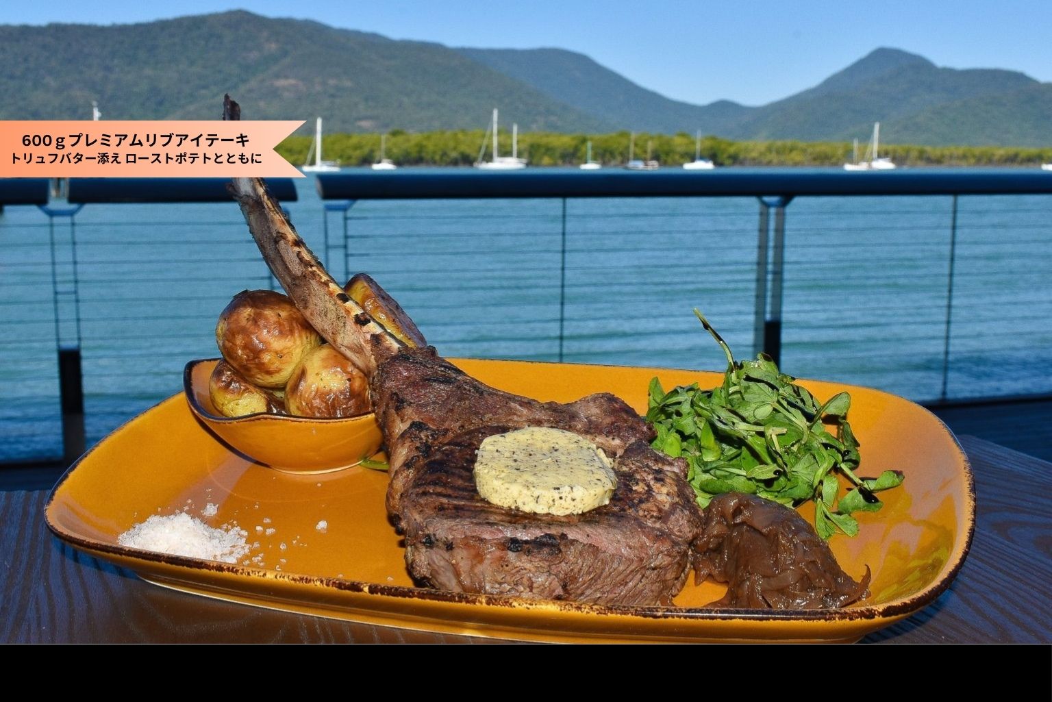 - 料金に含まれるもの ダンパー(オーストラリア伝統のパン)オーストラリア産スパイスとマカダミアオイル添え、前菜;ソルト&ペッパークロコダイル、スモークカンガルー、エミューのワンタン、メイン:600gプレミアムリブアイテーキ-トリュフバター添え ローストポテトとともに デザート:自家製アイスとシャーベットフルーツ添え(全て2名でシェアプレート)コーヒーor紅茶