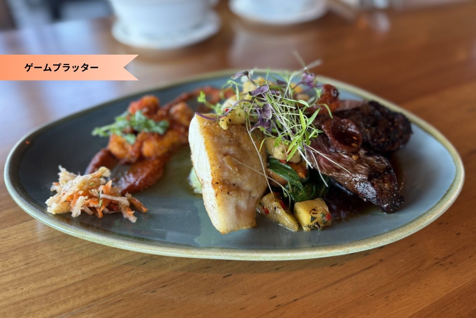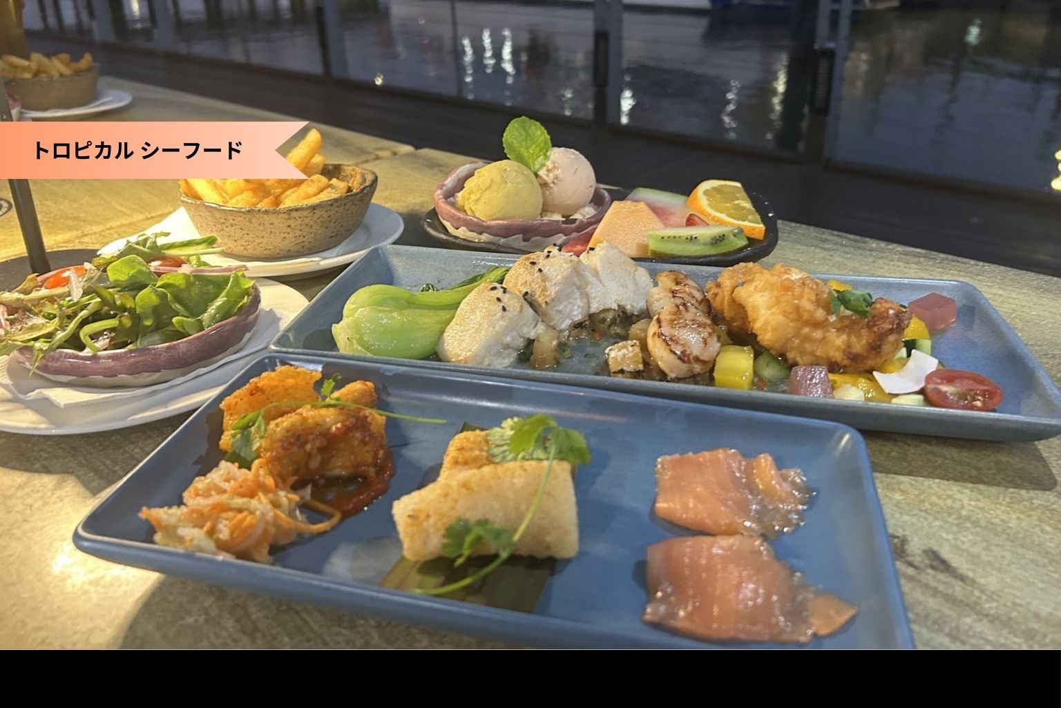 - 料金に含まれるもの 前菜:タスマニア産スモークサーモン、スパイス香るカラマリ(イカ揚げ)、ワニとエビの衣揚げレモンアスペンサンバルソース、メイン:ウチワエビの天ぷらマンゴーサルサとリベリーソース、ホタテのパイナップルサルサ添え、グレートバリアリーフ産白身魚のグリルフィレ、付け合わせ:オリジナルスパイス香るフライドポテトとさっぱりガーデンサラダ、デザート:自家製アイスとフルーツ添え