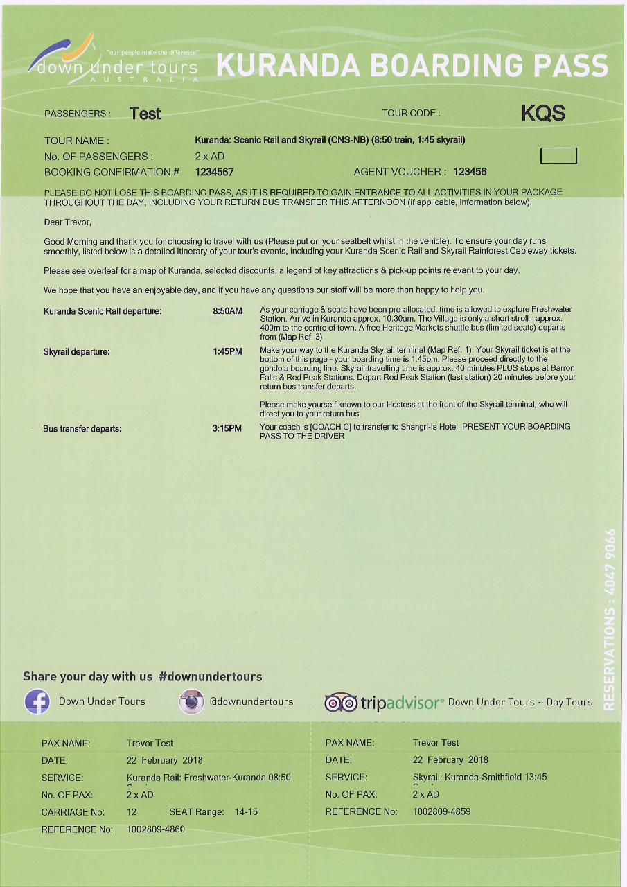 今朝、経験豊富なドライバーがホテルにお迎えに上がります。チェックイン手続きを行い、キュランダ搭乗券をお渡しします。これには詳細な旅程表と時刻表、キュランダ観光鉄道とスカイレールの乗車券が含まれており、搭乗エリアへ直接お進みいただけます。 指定時刻にスカイレール・レインフォレスト・ケーブルウェイにご乗車いただき、世界最古の熱帯雨林を横断する忘れられない旅をお楽しみください。途中2箇所で下車し探索が可能です。クランダ到着後は、直ちにクランダ駅へお進みいただき、オーストラリア随一のユニークな鉄道旅となる歴史あるクランダ観光鉄道にご乗車ください。 この有名な鉄道が壮大な滝を横切り、美しいバロン渓谷へと続く道中、クランダからフレッシュウォーター駅までくねくねと進む様子をゆったりとお楽しみください。フレッシュウォーター駅到着後、当社のバスがホテルまでお送りいたします。旅程表は6ヶ国語で用意されています。