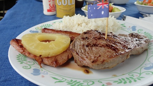 - ビーチにてオージーステーキバーベキューランチ。自由時間[ボディーボード、釣り、シュノーケリングなどでお楽しみください]