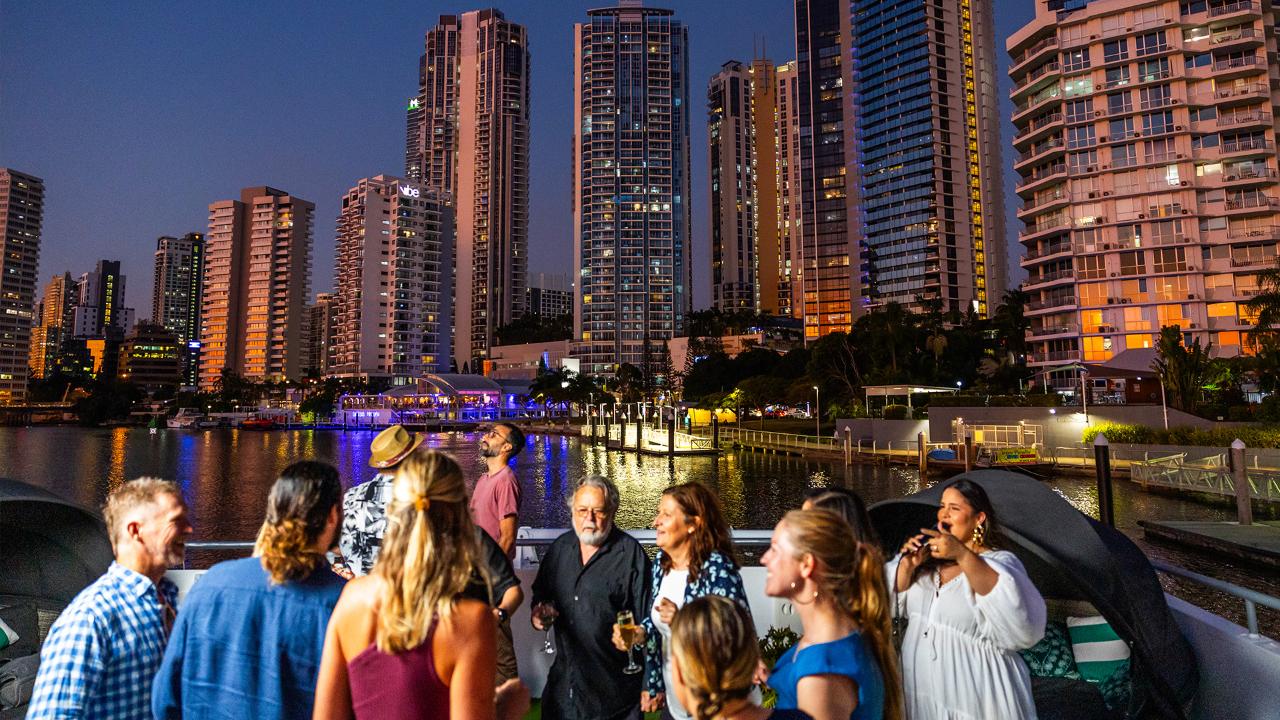 ゴールドコースト この豪華な2.5時間のビュッフェディナークルーズで、静かなゴールドコーストの水路を巡りながら、夕暮れ時の観光と食事をお楽しみください。