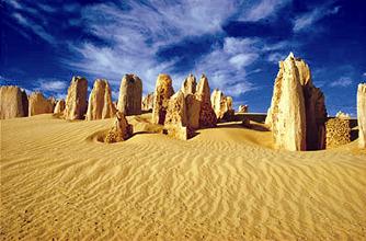 4WDの大型バスでパースの北にあるナンバン国立公園の一角”荒野の墓標”と呼ばれるピナクルズ奇岩群を目指します。往路はオーストラリアの動物が飼育された”カバシャムワイルドライフパーク”にてコアラ・カンガルー・ウォンバットと触れ合います。インド洋のビーチを見た後、ロブスター工場でランチを取り、いよいよピナクルズに向かいます。ピナクルズ砂漠に石灰岩が乱立するその光景は、他では絶対に味わえないものです。復路は純白の大砂丘がある”ランセリン”に立ち寄ります。4WD車の特長を活かして砂丘を縦横無尽に走ります。また砂丘でのサンドボーディングもお楽しみいただけます。元々内容満載のツアーで満足度が高く、あっという間の一日ツアーでしたが、新道路の開通により、更に気楽に行けるようになりました。春の時期には車窓から自然に自生する花々”ワイルドフラワー”が咲き乱れる様を見る事ができます。